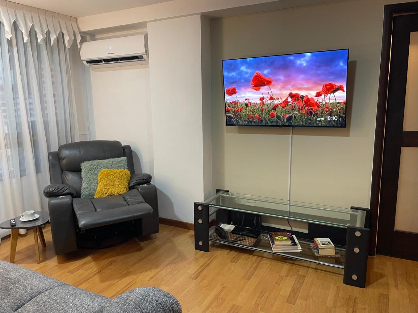 Two-Bedroom Apartment. The spacious apartment features 2 bedrooms and 2 bathrooms with a shower and free toiletries. Guests can make meals in the kitchen that comes with a refrigerator, kitchenware, an oven and a microwave. The air-conditioned apartment provides a flat-screen TV with streaming services, a washing machine, a tea and coffee maker, a dining area as well as city views. The unit offers 2 beds.